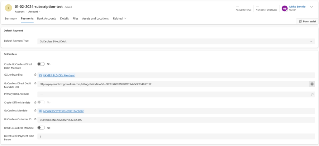 4. The user can optionally toggle the Read GoCardless Mandate field to true and save the record. This will automatically reset itself to false and it populates the GoCardless Mandate and GoCardless Customer ID fields from the GoCardless API, if the customer has successfully completed the onboarding flow and a direct debit mandate has been created on the GoCardless side. The step is optional because Bluefort TAPP also automatically refreshes the GoCardless mandates and their status once per day using a batch-based Power Automate flow.