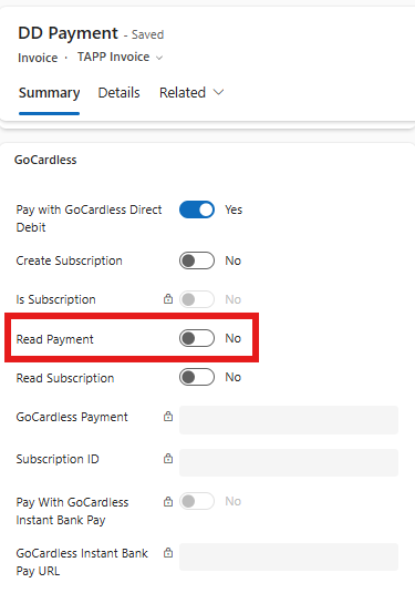 You have finished triggering a GoCardless Direct Debit payment. Once saving is complete, the user can toggle the Read Payment slider to synchronise the payment details to the Invoice record.
