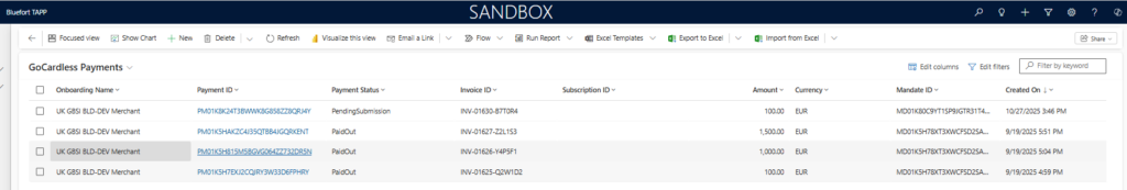 You have finished triggering a GoCardless Direct Instant Bank Payment. Once the customer provides the bank details in the GoCardless payment flow in the URL generated above to settle payment, the payment will also be created a record in the table called GoCardless Payments by the daily batch Power Automate flow that synchronises payments. In this table one can view GoCardless Payments resulting from Direct Debit, Instant Bank Payments or GoCardless subscriptions.