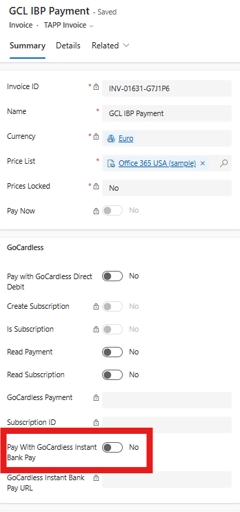 When the user wants to trigger an IBP payment for a non-zero invoice the user can simply toggle the Pay With GoCardless Instant Bank Pay fieldand save the Invoice record.