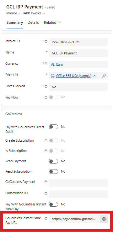 This will result in an IBP payment URL to be generated in the GoCardless Instant Bank Pay URL field. The payment page is secure and hosted by GoCardless and it can be shared with the customer via email or using Power Platform tools such as a Power Automate flow.