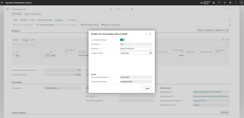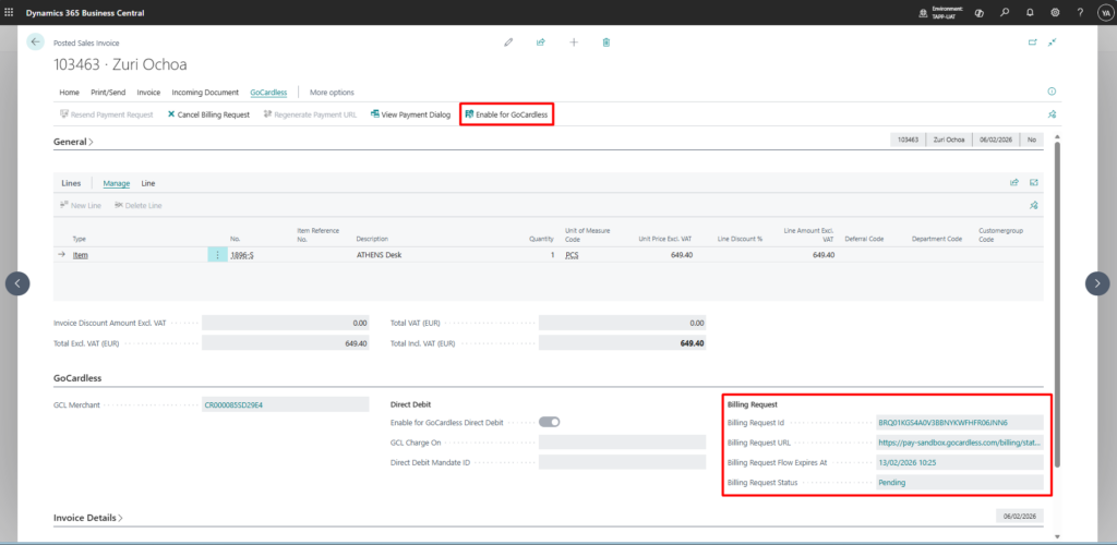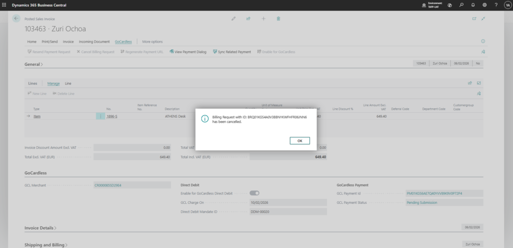 Posted sales invoices that originally generated a Billing Request can be converted to capture a payment from an already existing mandate linked to the invoice customer. When the payment is generated, the original Billing Request is automatically cancelled.