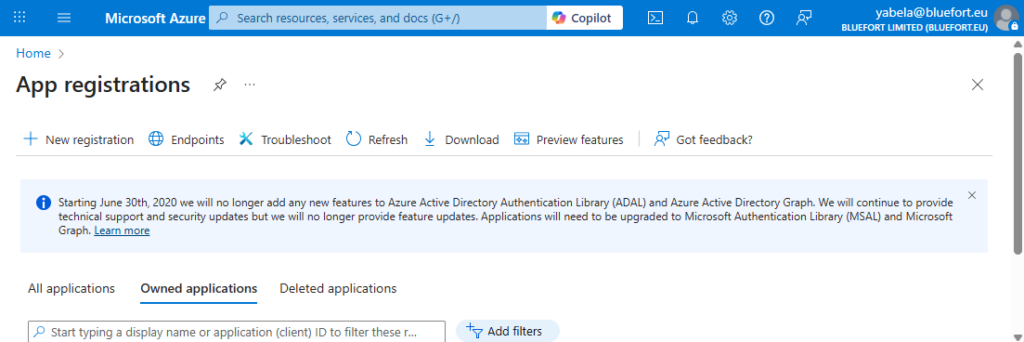 - Navigate to App Registrations and click on New Registration to create a new application.