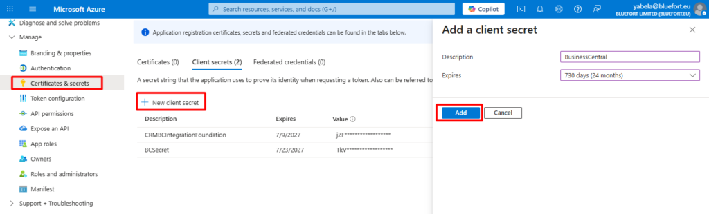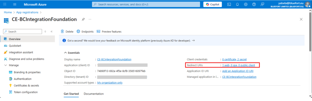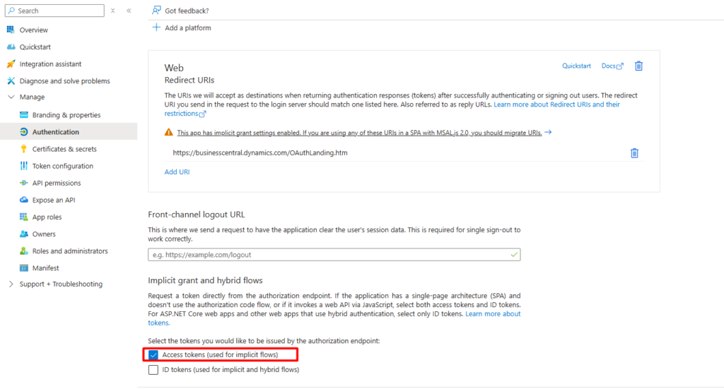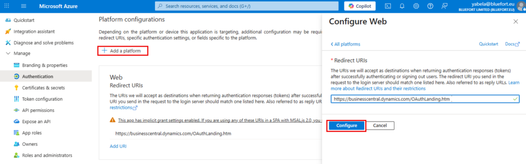 - Add a Web Redirect URI : https://businesscentral.dynamics.com/OAuthLanding.htm