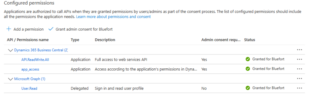 - Assign the Business Central and Microsoft Graph permissions as per below