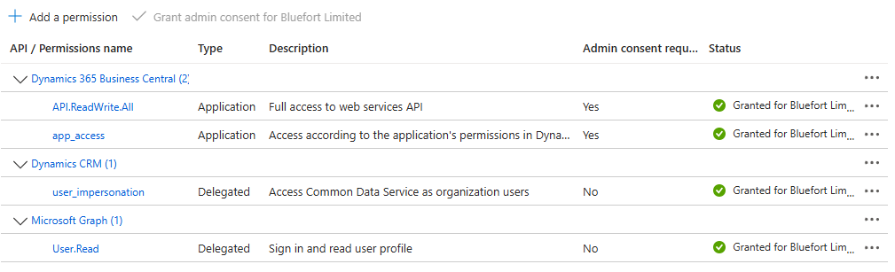 - Assign the Business Central and Microsoft Graph permissions as per below