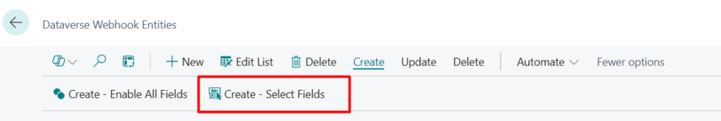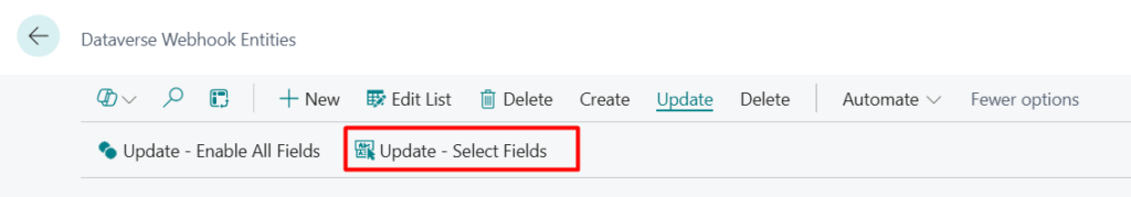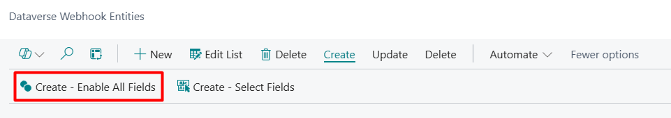 When all fields are required to trigger a webhook, use the Create – Enable All Fields and Update – Enable All Fields menu actions in the Dataverse Webhook Entities page.