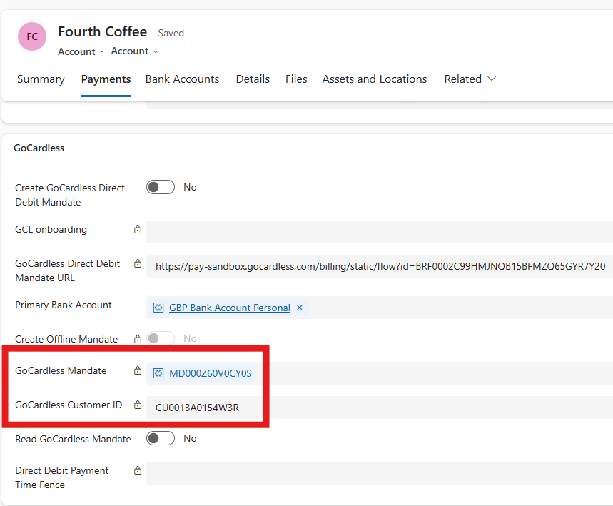 - Account or Contact must have an active mandate and customer id configured and selected in the GoCardless Mandate field and the GoCardless Customer ID field on the account or contact.