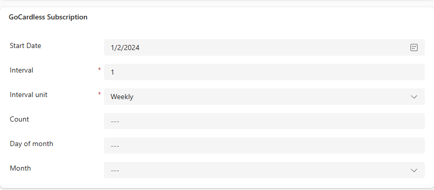 | Count | The number of times to withdraw a payment. This field is optional. If left blank, the subscription will go on forever until manually cancelled. |