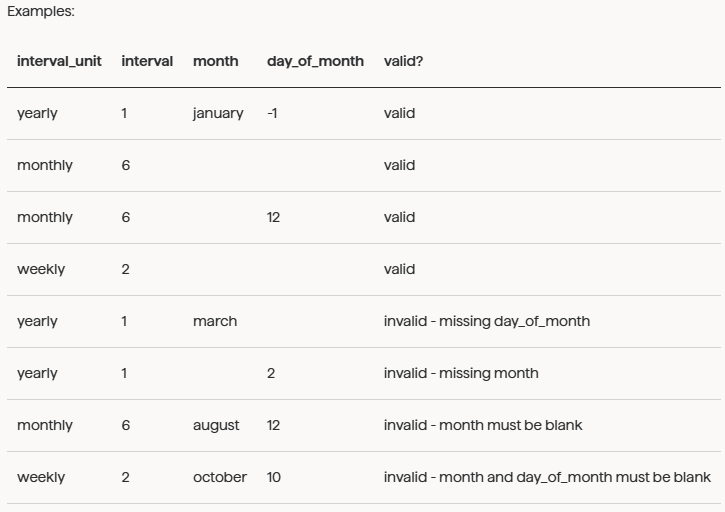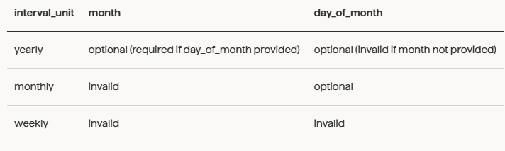 | Interval unit | The interval unit. The options are either Weekly or Monthly or Yearly. This is mandatory. |