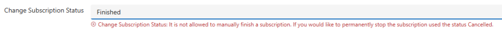 Finished should not be manually selected. Finished indicates that the subscription has gone through all of its cycles as configured in the Count field on the invoice record, which is optional.