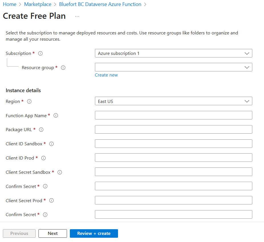 functionAppName: Your preferred name for the Azure Function app (Must be less than 15 characters)packageUrl: The package URI provided by BluefortclientIdSandbox&clientIdProd: Your app registration client IDs for sandbox and productionclientSecretSandbox&clientSecretProd: Your app registration secrets for sandbox and productionbcTenantId: Your Business Central tenant IDbcEnvironmentSandbox&bcEnvironmentProd: The BC environments for sandbox and production- CRM Application User Id Prod & CRM Application User Id Sandbox: The CRM Application User Ids for the Entra app registration setup in the pre-requisites