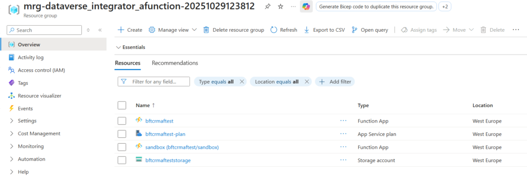 rg-crmbc-connector. - Click Create. Azure will start deploying the resources. Deployment may take a few minutes.