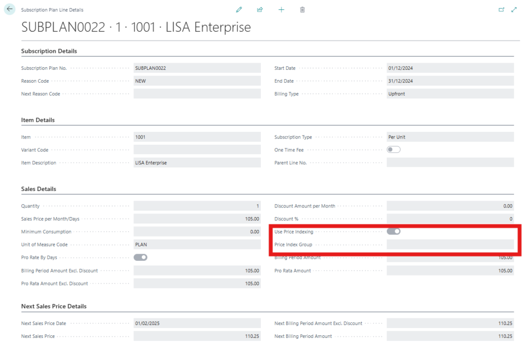 - If this is the case and matches the Price Indexing Group on the Subscription Plan line, the price index is applied.