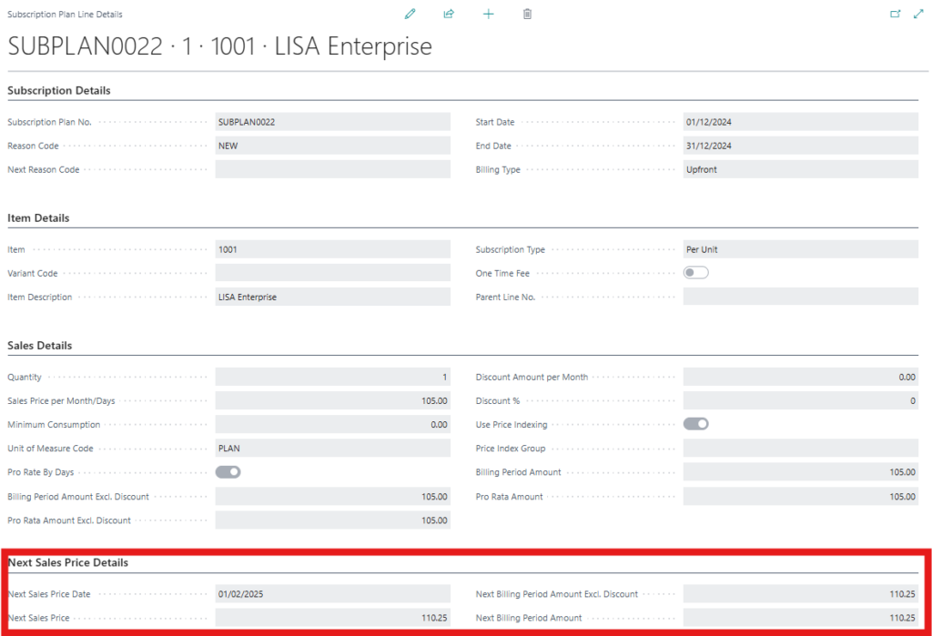 - Next Sales Price Date – shows when the next price index or price change will be applied to this subscription plan line.