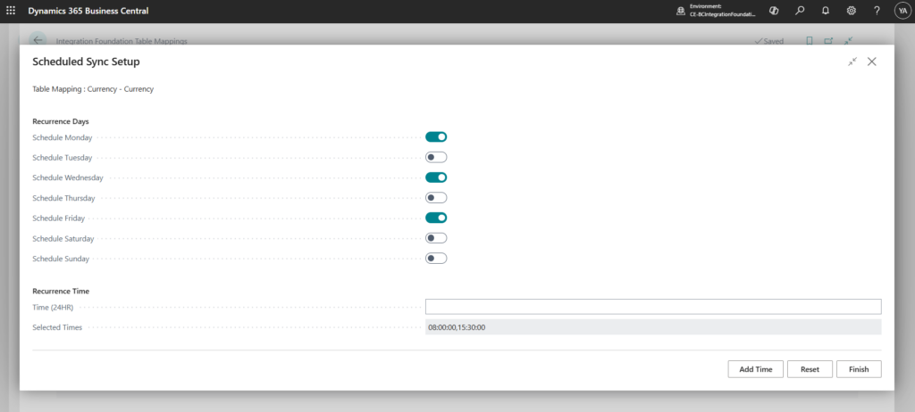 Example; in the below setup, the scheduled sync is set up to run every Monday, Wednesday and Friday at 08.00 and 15.00.