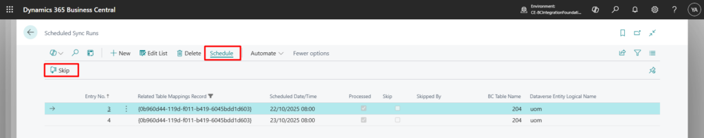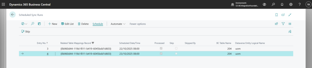 Table mappings can be configured to run on a scheduled synchronization rather than instant sync. Scheduled sync is particularly useful for entities where records are created in high volumes and do not need to be immediately available in Dataverse. This approach helps optimize system performance while maintaining controlled and predictable data exchange.