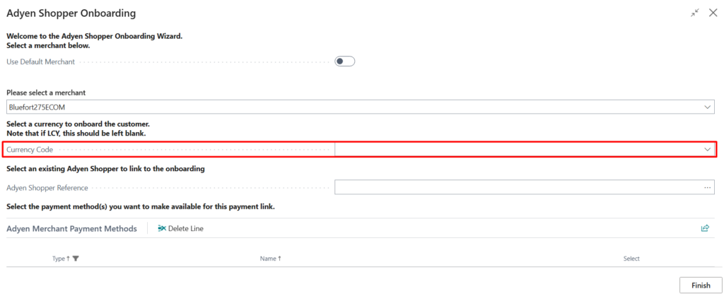 Step 3 (optional): You can select a specific currency code to onboard with.