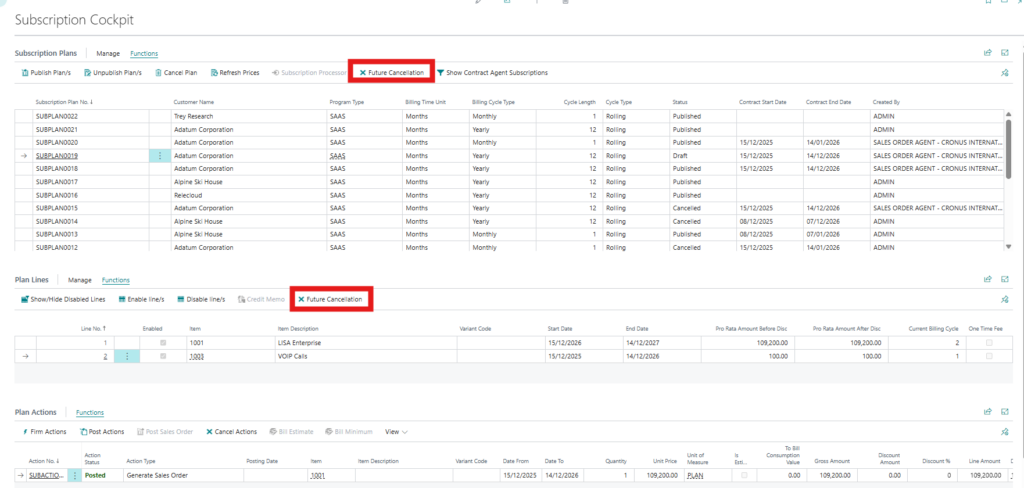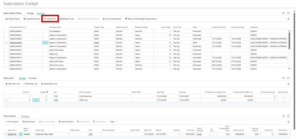 From a financial perspective, the Cancel with Reversal option ensures billing accuracy and compliance by allowing previously invoiced periods to be selectively reversed and issued as credit memos, reducing manual corrections and improving auditability. The ability to disable individual subscription plan lines without cancelling the entire plan supports granular service management, enabling businesses to adapt subscriptions to changing customer needs while preserving historical continuity of billing cycles.